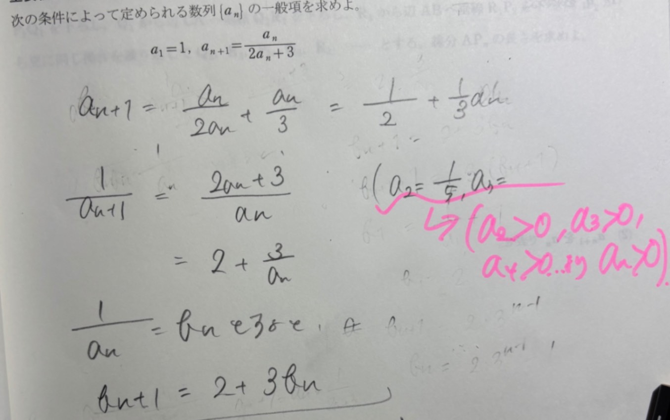 ①逆数を取るという変形は、分数の形の漸化式では定石の一つです。いつでもうまくいくというやり方ではないですが、このように逆数を取るとうまくいくことがあるので「なぜ変形する必要があるのか」ではなく、「こうやるとうまくいく」からやるのです。